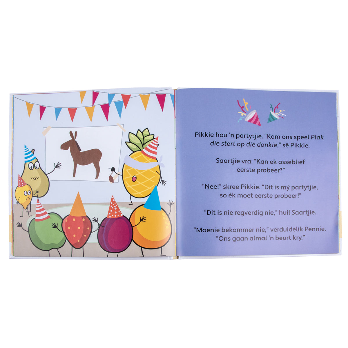 Pikkie Pynappel en Saartjie Suurlemoen verskyn in al die stories saam met die bepaalde vrug wat in daardie storie voorkom. Hierdie vrug leer vir Pikkie en Saartjie ’n karakterles in verhouding tot die vrug van die Gees wat hulle voorstel.