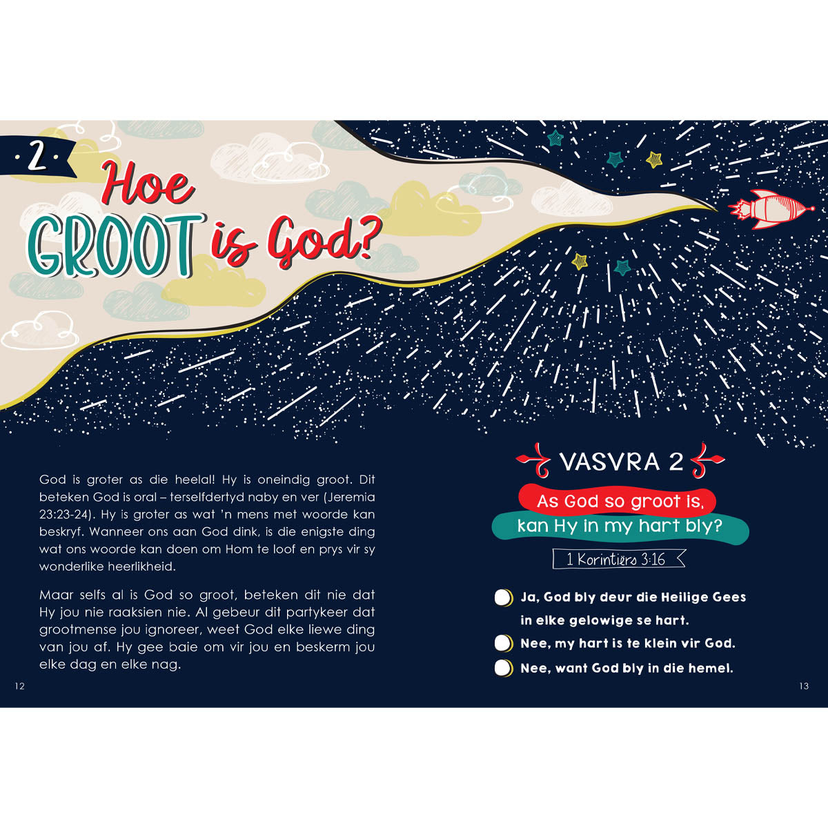 Elke vraag bevat genoegsame Skrifverwysings, ʼn kort bespreking asook ʼn interessante veelkeuse-vraag wat kinders self kan antwoord. Twee woordraaisels is ingesluit wat kinders uitdaag om al die name van die boeke in die Ou en Nuwe Testament op te spoor. Daar is ook ’n afdeling met kort opsommings van elke boek van die Bybel, met sleutelverse uit die boek wat gememoriseer kan word.