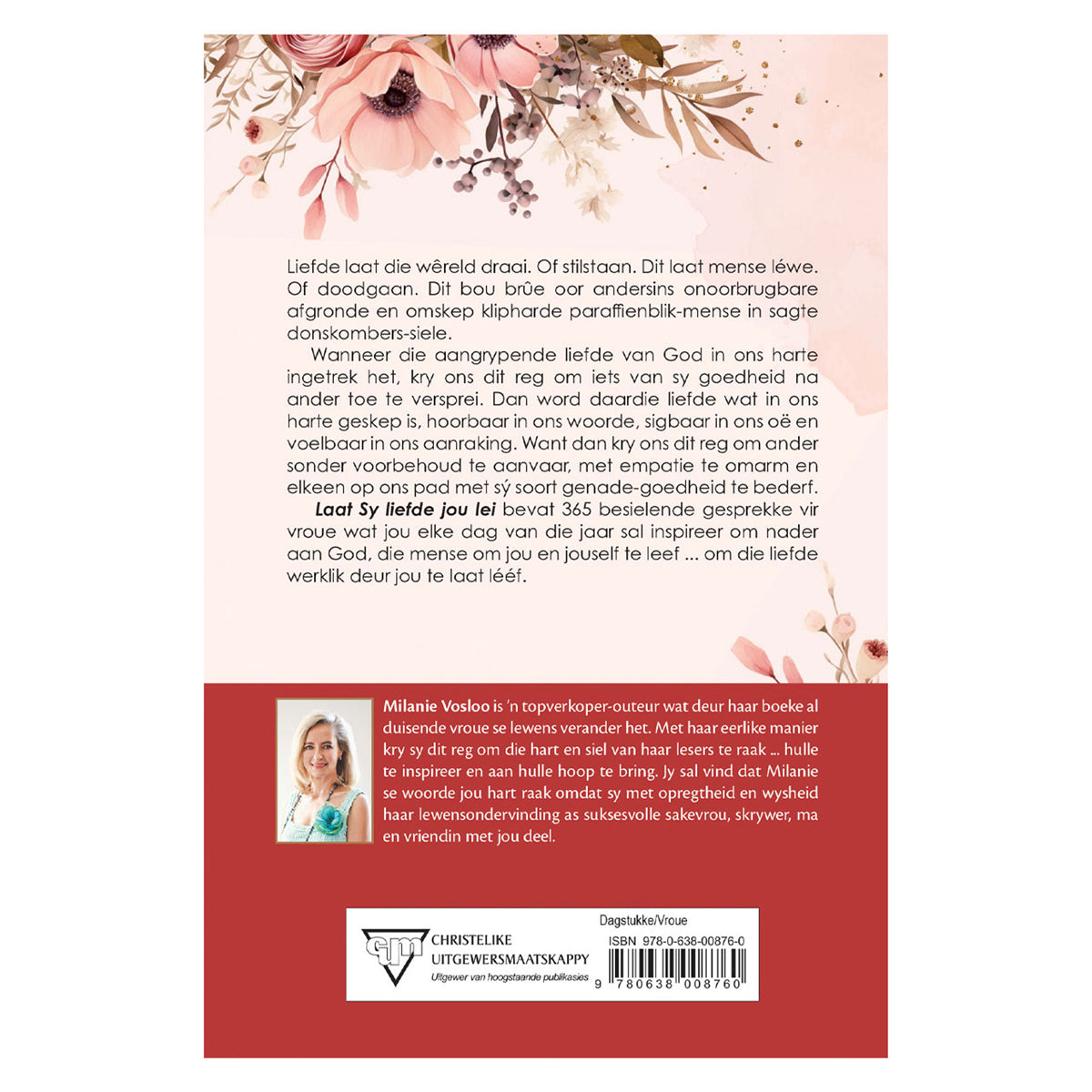 Laat sy liefde jou lei deur topverkoper-outeur Milanie Vosloo is geskryf vir vroue wat weet dat die lewe, hulle self en ander nie perfek is nie, maar wat steeds in die liefde glo. Die dagstukke verseker vroue: Wat jou drome en ideale ook al is, waar jy jou ook al op die lewenspad bevind, laat God se liefde jou lei in alles wat jy doen, en jy sal sy vrede en vreugde ervaar.