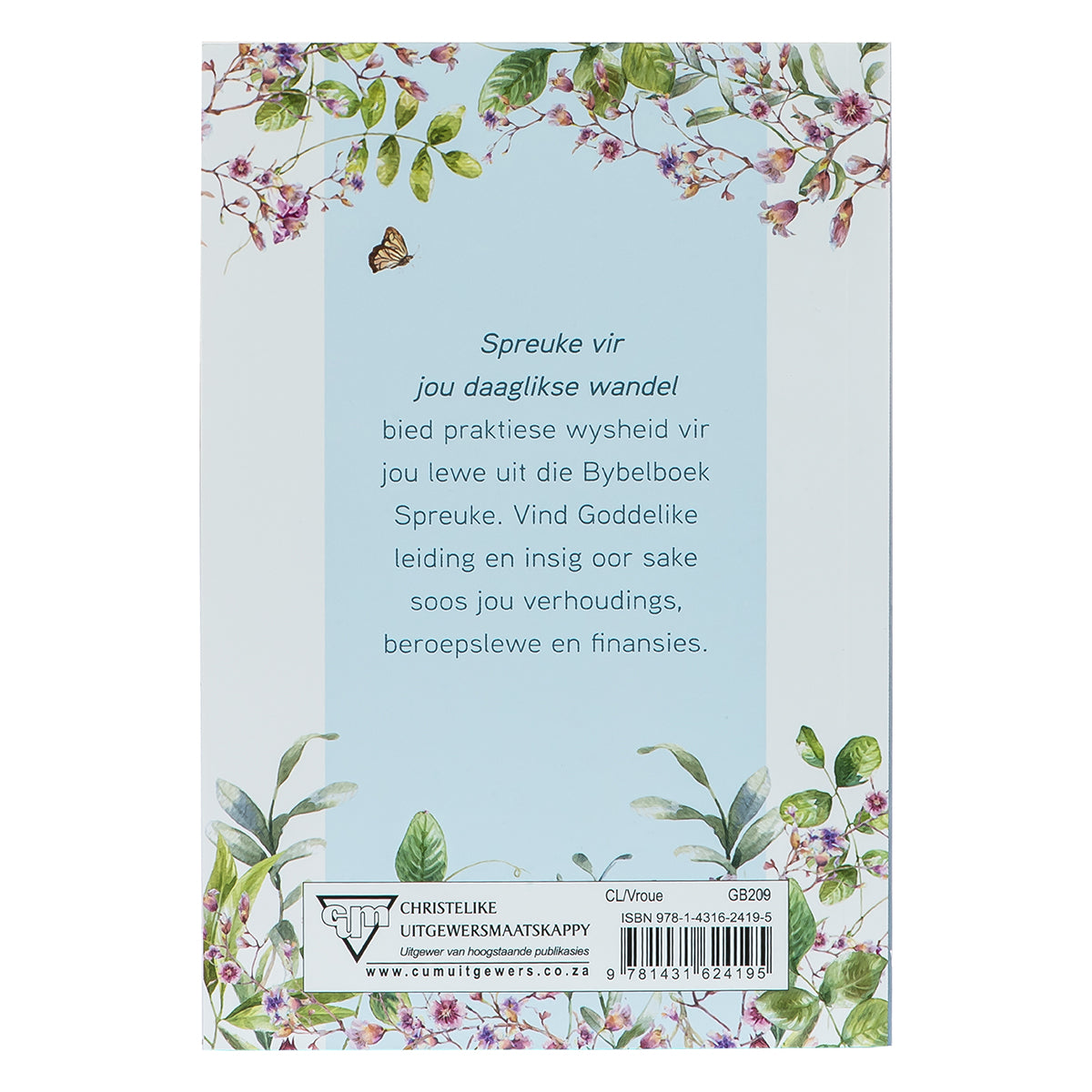 Spreuke vir jou daaglikse wandel bied praktiese wysheid vir elke gelowige oor ’n verskeidenheid lewensaspekte. Die versameling bemoedigende teksverse uit Spreuke is tematies gerangskik en bied leiding en insig oor sake soos jou verhoudings, beroepslewe, finansies en ander aspek van die lewe.