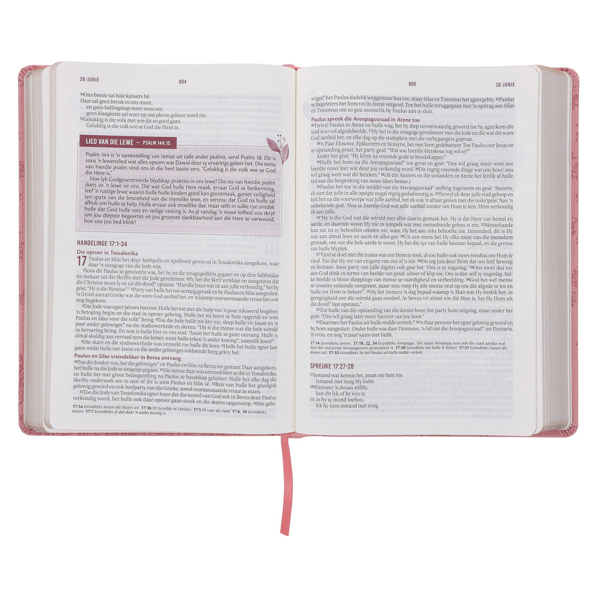 Die daaglikse indelings van die Ou en Nuwe Testament, saam met gedeeltes uit Psalms en Spreuke, nooi vroue om die hele Bybel in ’n jaar deur te lees. Die oordenkings vir elke oggend en aand sal hulle bemoedig om hierdie Bybel jaar na jaar te lees terwyl hulle die Skrifwaarhede oor verhoudings, werk, familie, geloof, gebed en persoonlike groei in hulle lewens toepas.