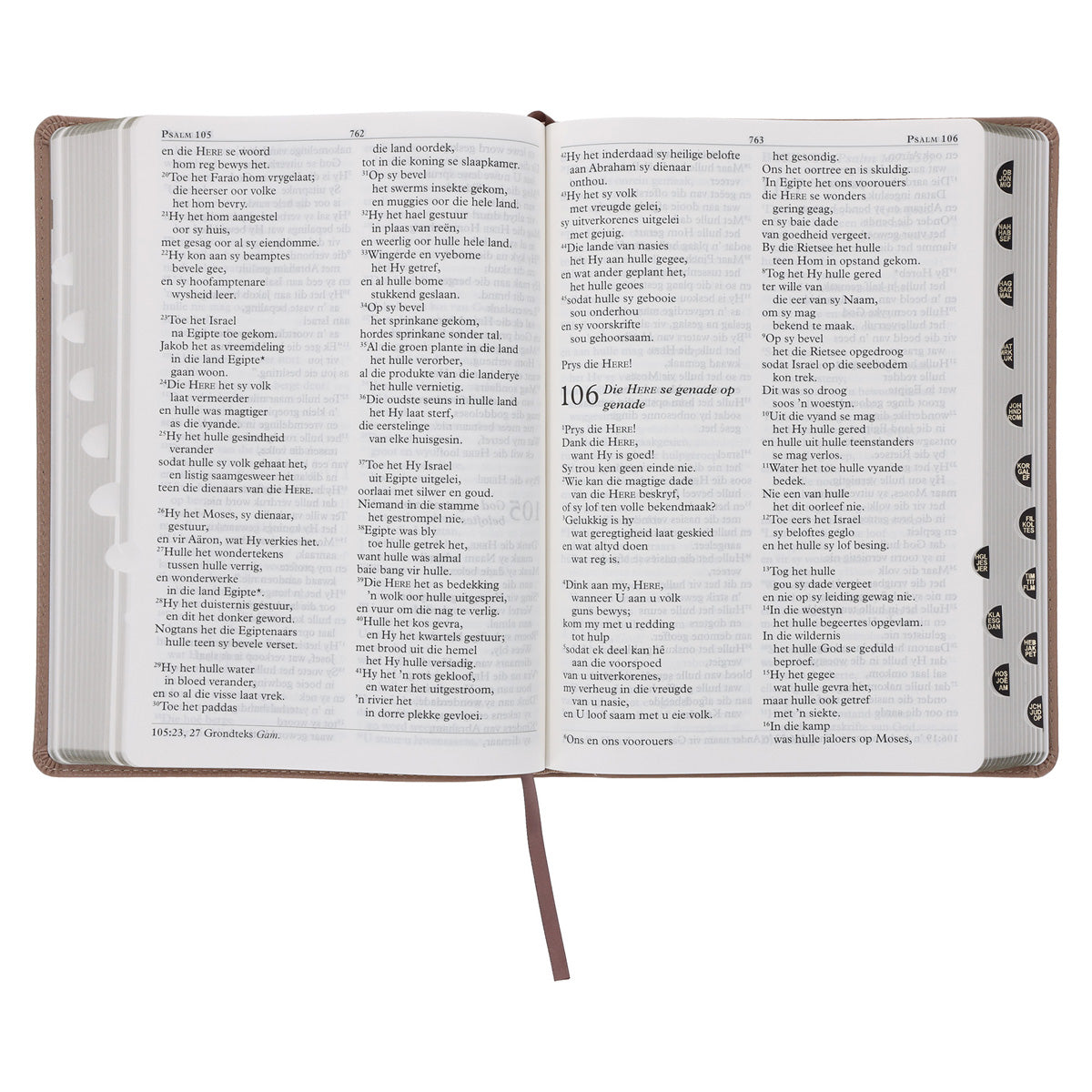 Hierdie grootdruk-uitgawe met egte leer-omslag beskik oor die volgende kenmerke: