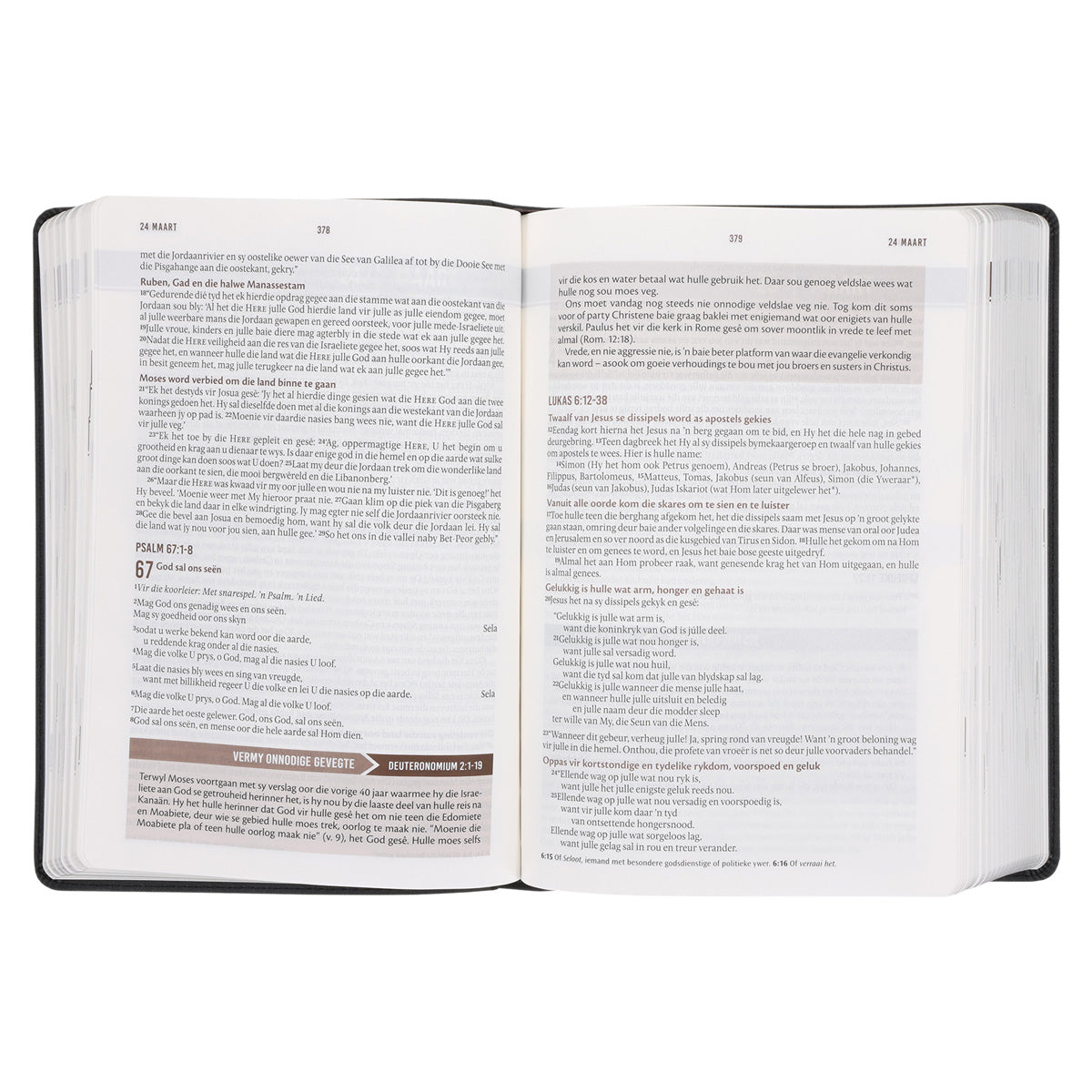 Hierdie Bybel is die perfekte metgesel vir jou daaglikse wandel met Christus, of jy nou ’n besige pa is, ’n hardwerkende sakeman of bloot jou verhouding met God wil verdiep. Begin vandag jou reis en leef in die volheid van God se genade en liefde!