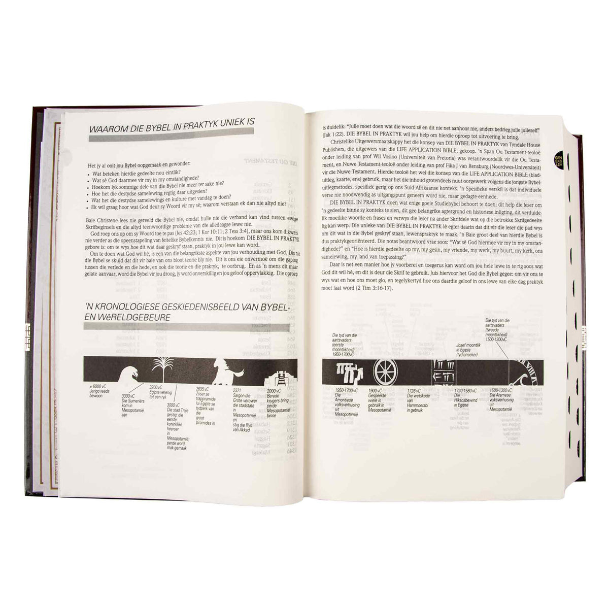 Die Bybel in Praktyk is ’n unieke Studiebybel in Afrikaans wat die Bybelleser sal help om sy kennis van en insig in die Woord van God te verbreed én te verdiep. Hierdie Bybel met die volledige teks van die Bybel in Afrikaans 1983/1992 bevat verklaringsnotas en aantekeninge wat help om ’n Skrifgedeelte binne sy konteks te verstaan. Verder verskaf dit belangrike agtergrond en historiese inligting, dit verduidelik moeilike woorde en frases, en dit sluit ook kruisverwysings, karaktersketse, kaarte, rubrieke en diagramme in, wat telkens op dieselfde bladsy voorkom as die gedeelte waarop dit betrekking het.