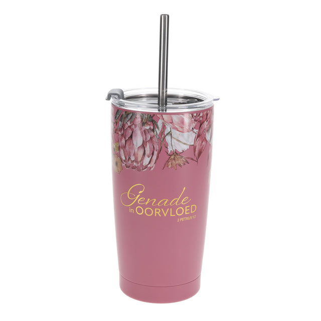 Genade in Oorvloed Afrikaans Stainless Steel Travel Mug with Straw