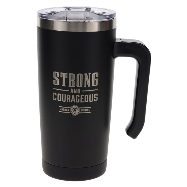 Strong and Courageous Black Stainless Steel Travel Mug with Handle is backordered and will ship as soon as it is back in stock.