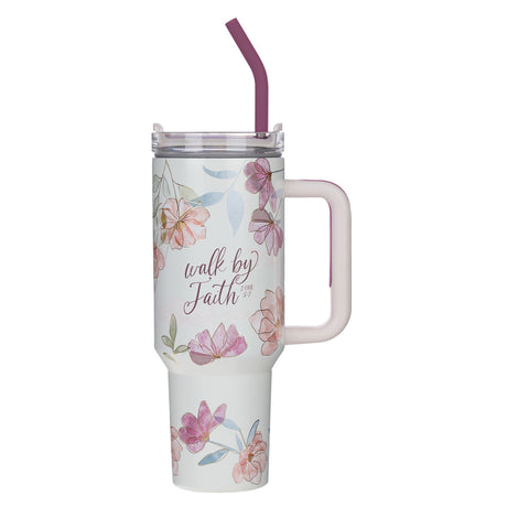 Walk by Faith White Floral Large Stainless Steel Mug with Handle and Straw