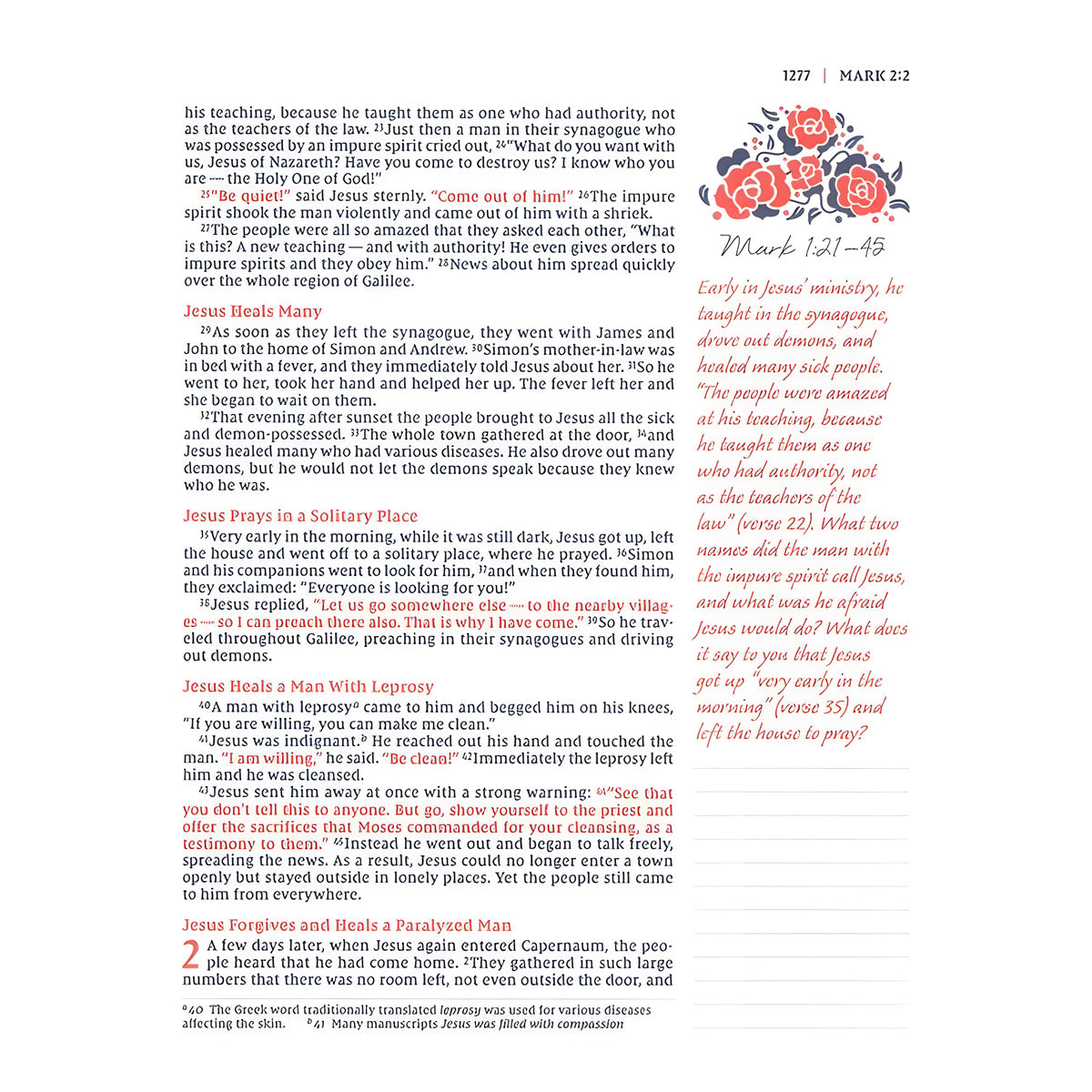 Do you seek stillness and inspiration in your quiet time? The NIV Journal the Word® Bible for Women guides you through God’s precious Word with reflections and thought-provoking questions placed beside Scripture. Explore God’s Word for you and express your heart in the wide margins of this journaling Bible with room for responses, journaling, and artistic expression.