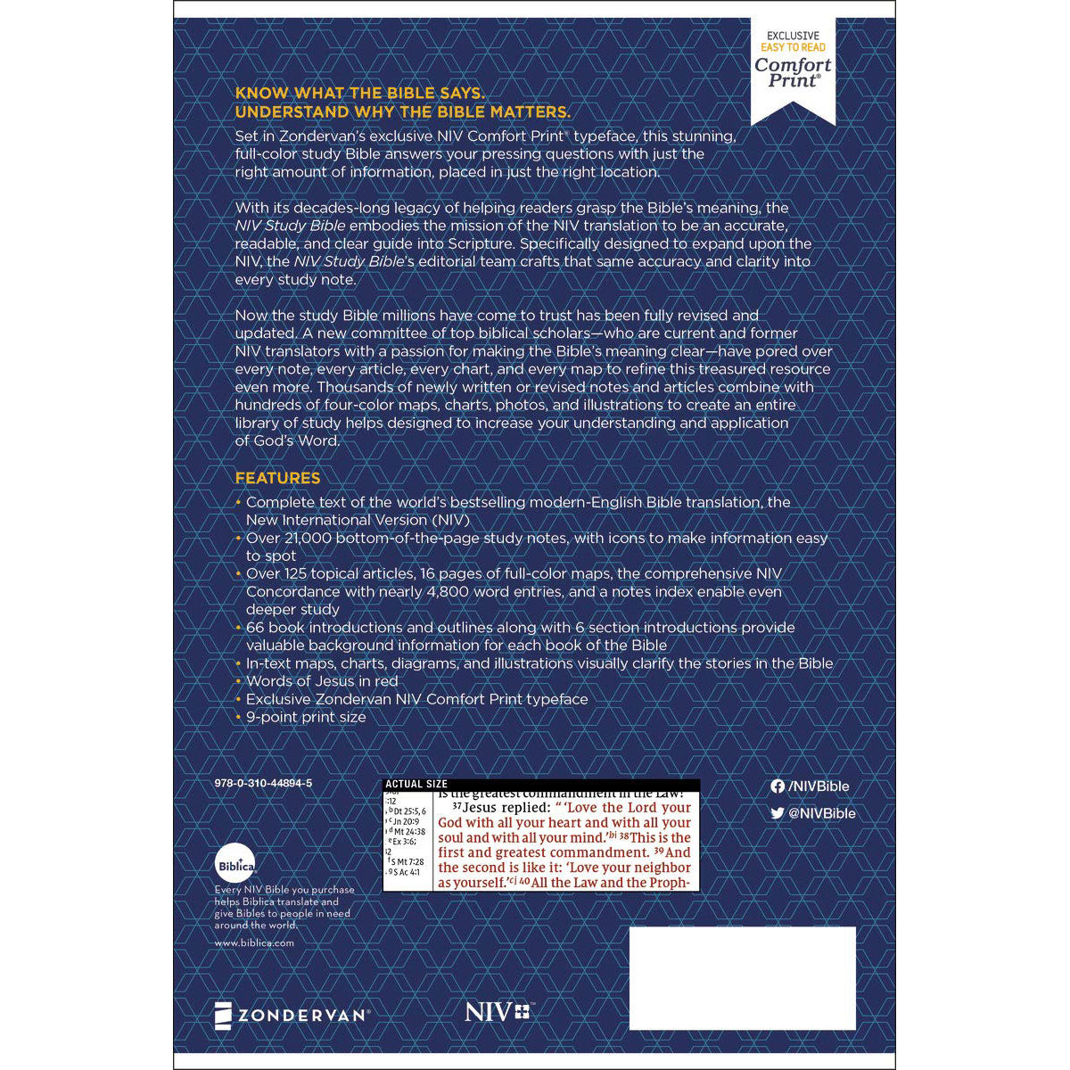 With its decades-long legacy of helping readers grasp the Bible’s meaning, the NIV Study Bible embodies the mission of the NIV translation to be an accurate, readable, and clear guide into Scripture. Specifically designed to expand upon the NIV, the NIV Study Bible’s editorial team crafts that same accuracy and clarity into every study note.