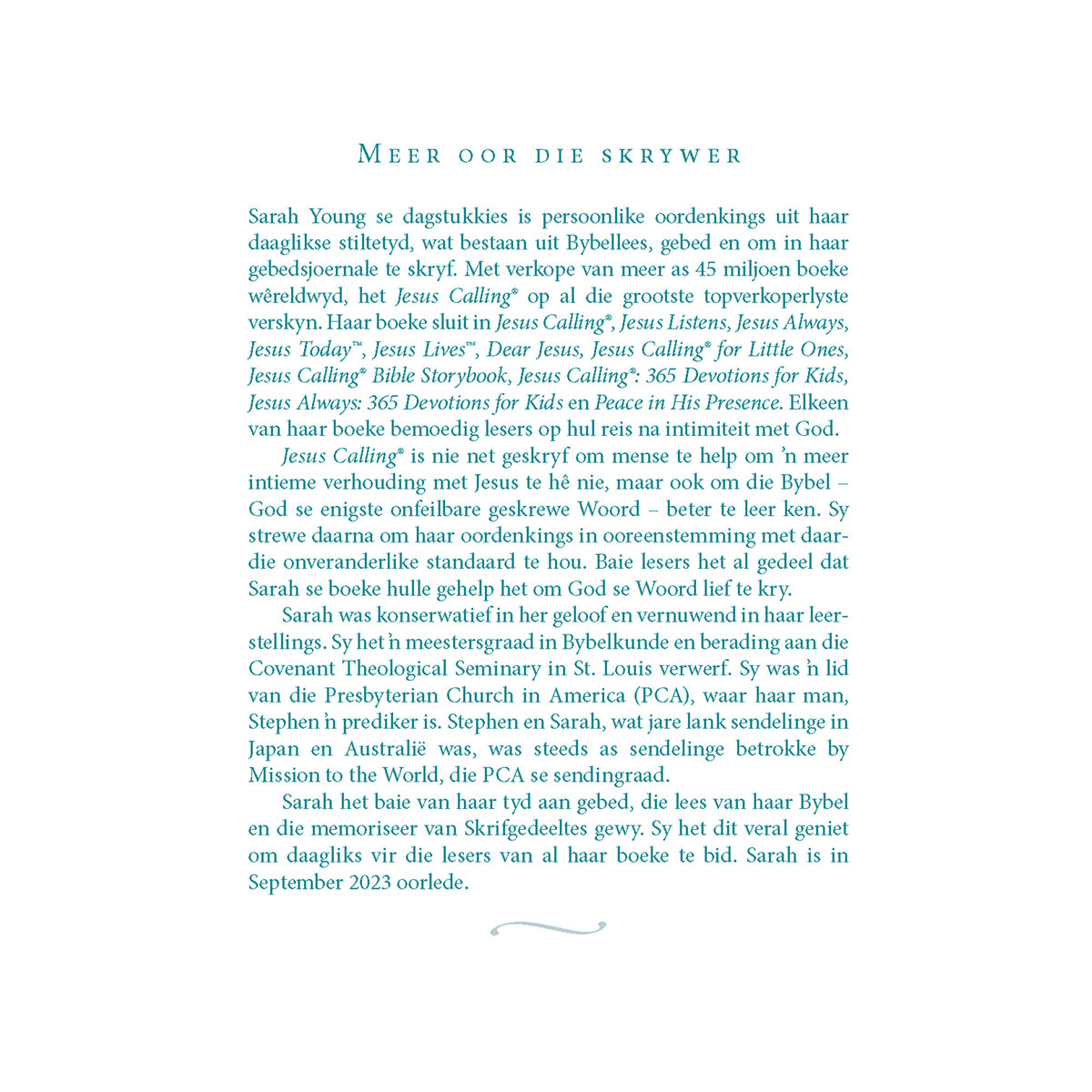 Baie van ons will graag bid, maar weet nie waar om te begin of wat om te sê nie. In Jesus luister: Dagstukkiegebede vir Vrede, Vreugde en Hoop, 'n 366-dagstukkiegebedeboek, word jy uitgenooi om jou verhouding te verdiep met die Een wat met oneindige liefde na jou gebede luister.