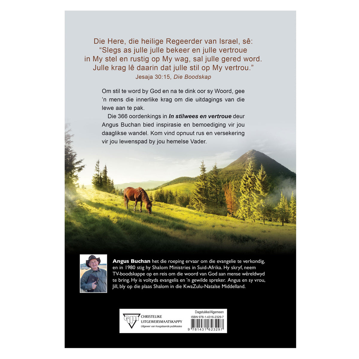 In stilwees en vertroue is 366 oordenkings deur die bekende evangelis Angus Buchan. Elkeen van die daaglikse teksverse, inspirerende oordenkings en diepsinnige gebede sal jou toerus met die krag van die Heilige Gees om sterk te staan teen elke dag se uitdagings. Nou is die tyd om God te vertrou. Bring daarom tyd saam met Hom deur, want ons krag lê in stil wees en vertroue hê (Jes. 30:15).