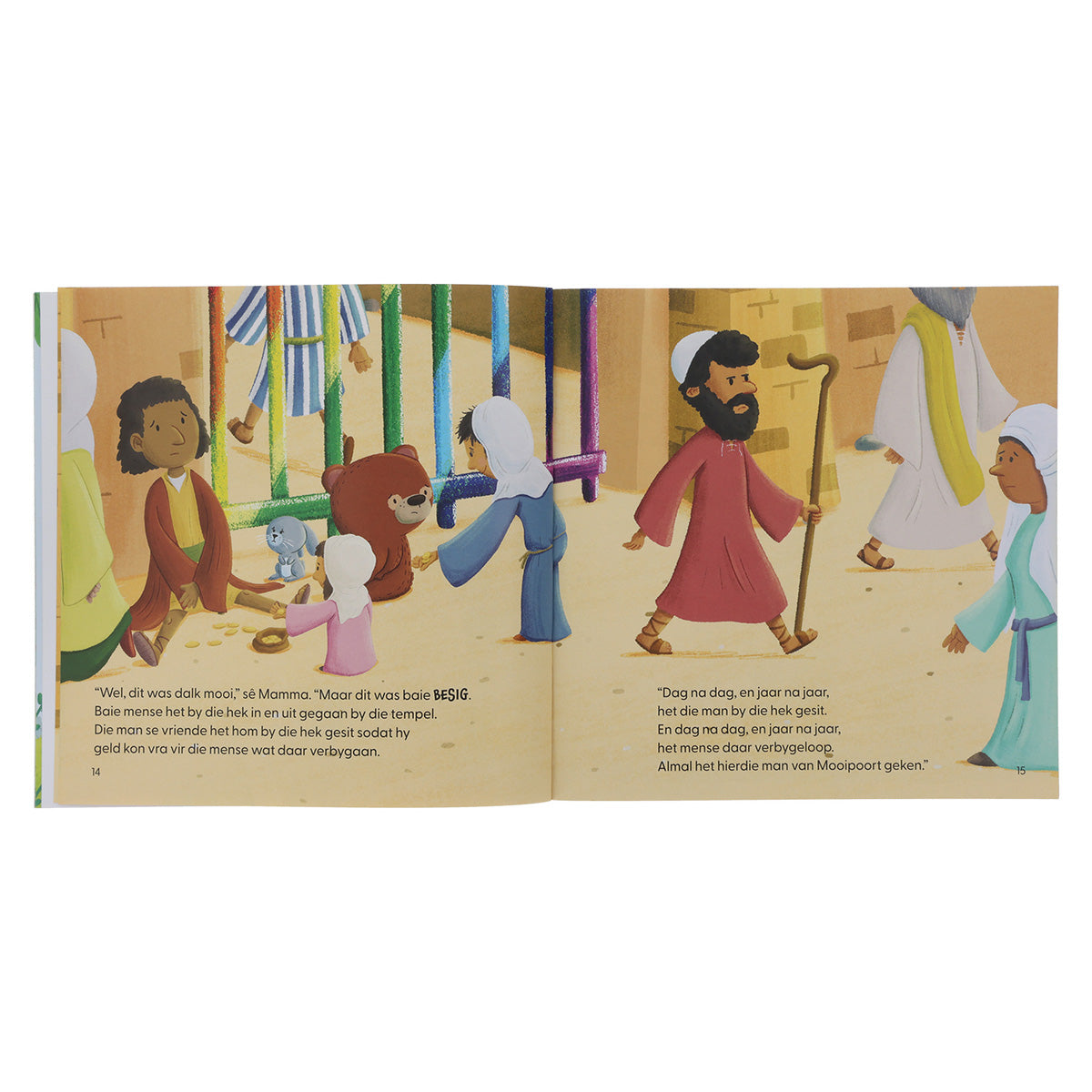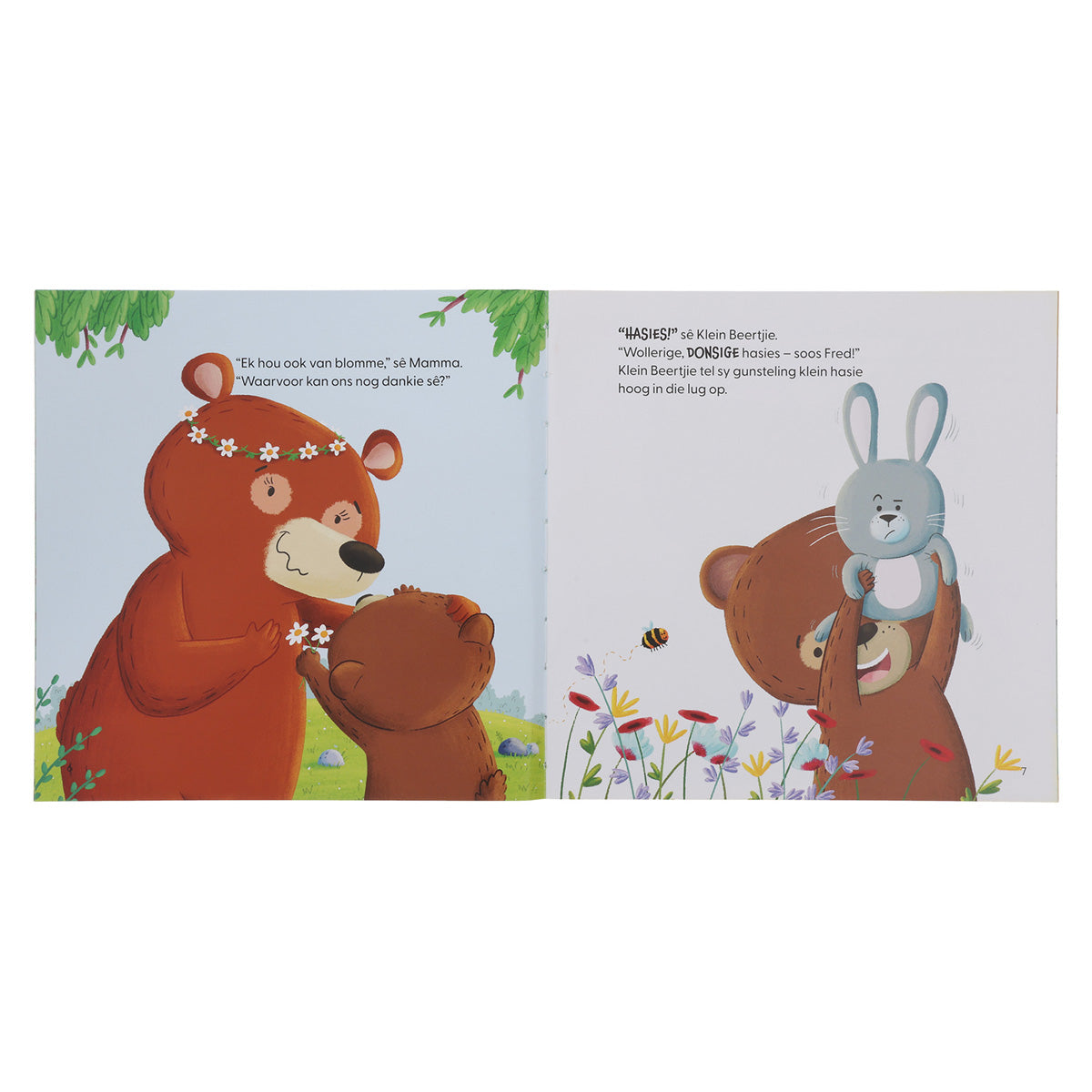 In Klein Beertjie sê vir God dankie vertel Mamma Beer vir Klein Beertjie die storie van Petrus en Johannes wat ’n man genees het, en hoe hierdie man op ’n wonderlike manier vir God dankie gesê het.