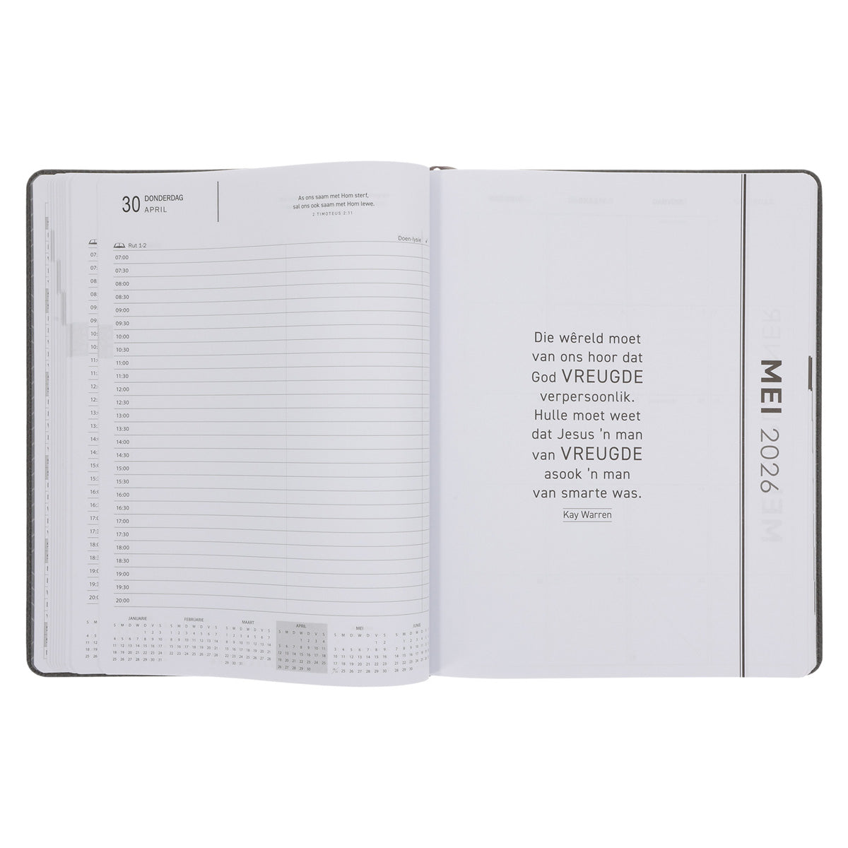 • ’n 12-maande-dagbeplanner (Januarie 2026-Desember 2026) in A4-formaat
